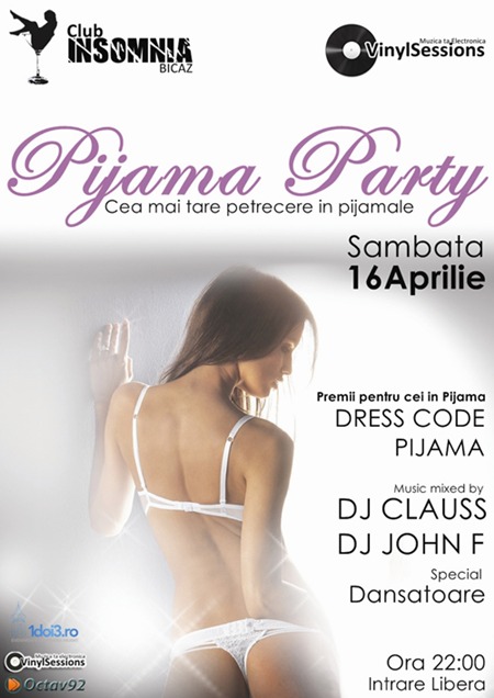 Sambata, 16 aprilie 2011, de la ora 22:00 in Club Insomnia din Bicaz are loc o petrecere in pijamale. Se vor aferi premii pentru cei care sunt imbracati in pijama dar mai ales vor fi si dansatoare ca seara sa fie mai fierbinte.